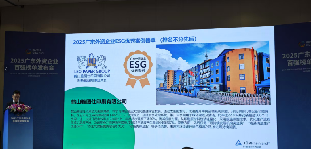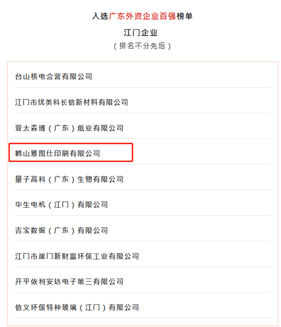2025年10月30日,广东外资企业百强榜单发布会在广州举行,江门10家企业上榜。鹤山雅图仕印刷有限公司载誉而归,同时入选: