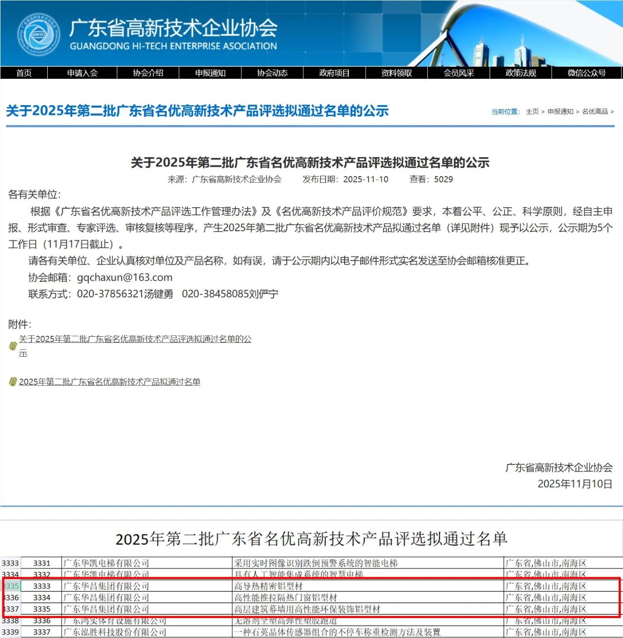 近日,广东省高新技术企业协会公示了“2025年第二批广东省名优高新技术产品评选拟通过名单”,华昌集团凭借“高导热精密铝型材”“高性能推拉隔热门窗铝型材”和“高层建筑幕墙用高性能环保装饰铝型材”三大创新产品成功上榜,技术实力再获权威认可。