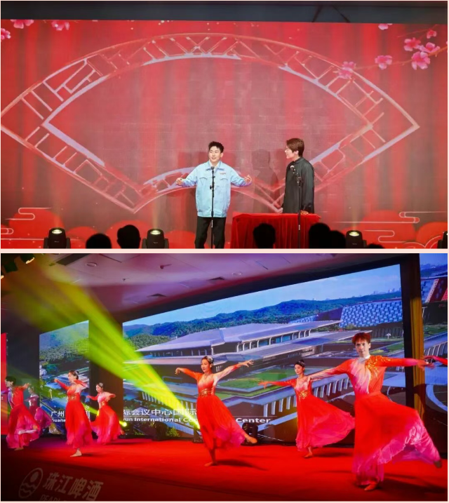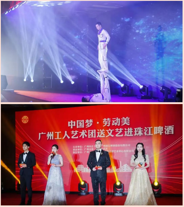 当天,广州市职工书画协会送书画进珠江啤酒,用书画致敬劳动,祝福发展,书写喜悦与荣光。同时,由广州市总工会组织的“中国梦·劳动美”广州工人艺术团送文艺进珠江啤酒专场活动精彩上演,联合珠江啤酒职工节目一起扎根制造业沃土,弘扬劳模精神、劳动精神、工匠精神,让劳动之美在文艺浸润中绽放光彩。节目在激昂歌声中传递奋进力量,在动人舞蹈中展现蓬勃奋进气象,在精彩相声中刻画学艺的精髓,在精湛杂技中汇聚奋斗者的拼搏与力量。其中,珠江啤酒职工原创歌曲《举杯吧,珠江啤酒》在悠扬旋律中传递“四十年的梦酿成金黄”的匠心传承,更生动形象展示“会做人、会做事、会生活”的员工形象。活动最后,以珠江啤酒企业之歌《江上明珠》大合唱唱响“酿造至纯,让生活更真”的未来华章。