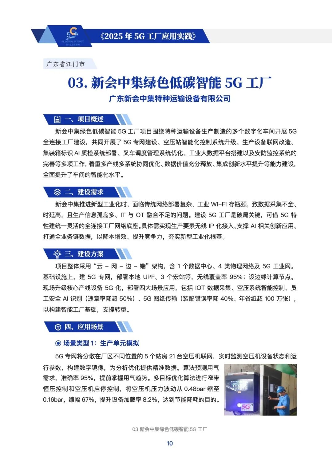 日前,工业和信息化部印发《2025年5G工厂典型应用实践》,遴选100个技术先进、标杆引领的5G工厂典型应用实践项目(以下简称“百家5G工厂”)。据了解,此次遴选出的百家5G工厂覆盖原材料工业、装备工业、消费品工业、电子信息、能源交通等重要行业领域。百家5G工厂实现了5G网络覆盖率超99.3%、现场装备联网率超97.7%、无线设备5G联网率超97%,推动“5G+工业互联网”由“单点”应用向全环节、全流程、全要素、全场景、全产业链“综合”应用创新发展,有效推动制造业提质降本增效绿色安全发展。其中,广东新会中集特种运输设备有限公司凭借在“5G技术+智能制造”的深度融合与实践成功入选。